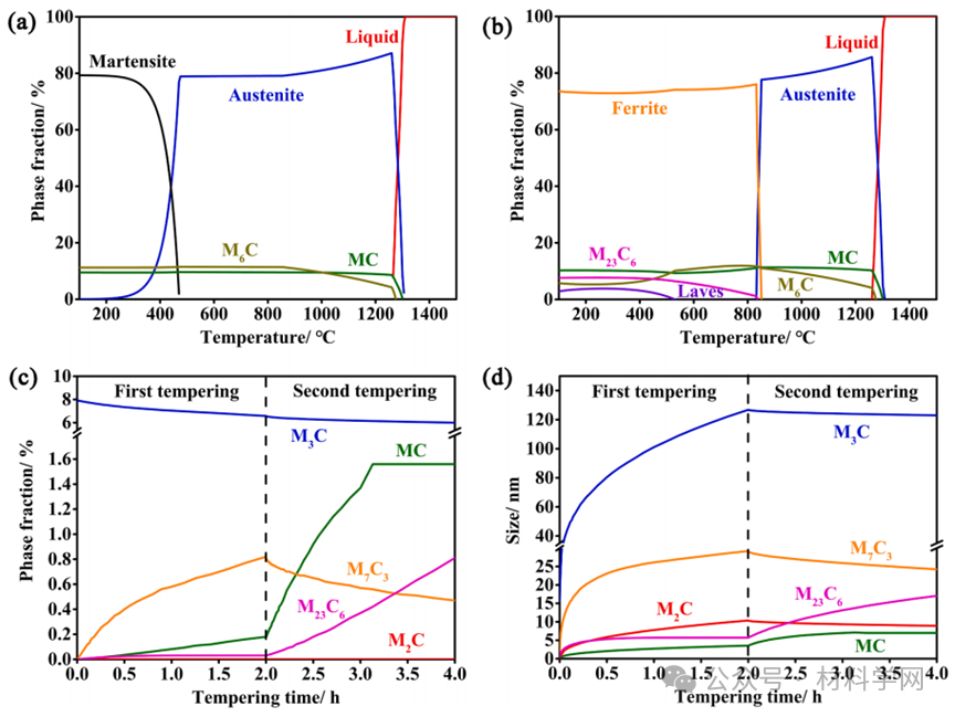 3. 实验数据与热力学计算之间的差异表明了进一步改进的机会,例如,仅在模型预测下出现的M23C6、M3C和M7C3三种碳化物之间的相互作用,以及实验观察到的初级碳化物和纳米颗粒属于MC、M2C/M6C和可能的M23C6基团。