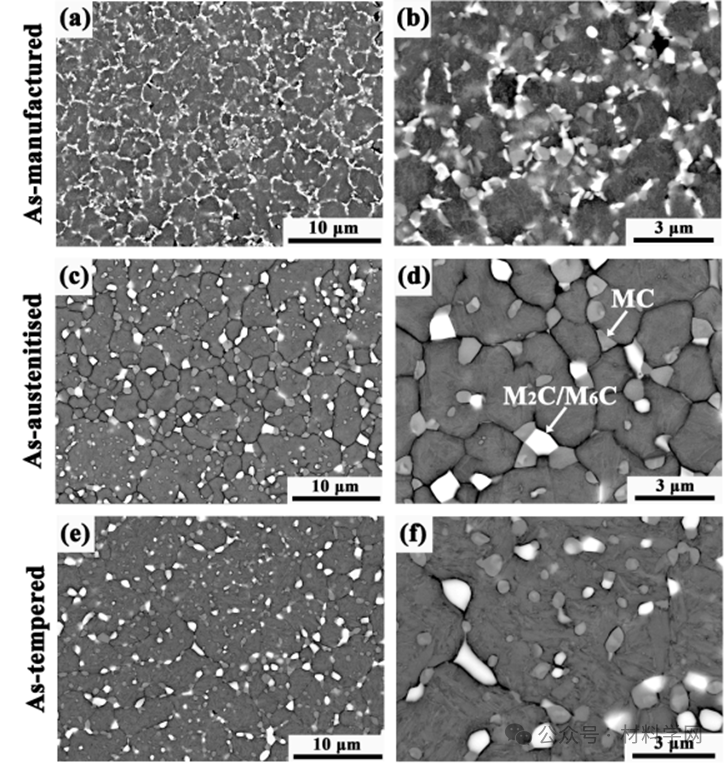 Saewe等[14]研究了不同碳浓度下HS6-5-3-8工具钢及其变体的增材加工性能和显微组织。结果表明,随着碳含量的增加,钢的硬度从650±37 Hv(约58 HRC)降至570±31 Hv,但析出的碳化物较多。他们将这种现象归因于碳诱导的基体中较软的残余奥氏体的稳定。Sander等人[15]所做的工作很可能是AM工具钢的第一篇报道,他们发现碳化物均匀分布在不连续的网络中,这被认为是900 Hv高硬度的部分原因(约67 HRC)。 Greenen等[16]通过比较激光粉末床熔合、热等静压和铸造材料,对AM M3:2工具钢进行了研究。在碳化物方面,AM钢的碳化物粒度最小,为1 μm;HIP钢为2 ~ 5 μm,铸钢为40 ~ 100 μm。他们还检查了后处理热处理的影响,揭示了不同状态的硬度最大值相对接近,范围从920到945 Hv(约68 HRC)。此外,对AM M50工具钢的研究探讨了碳化物及其在后处理热处理过程中的演变[17-19]。然而,这些研究以及少数报道热处理对增材制造工具钢中碳化物演化影响的工作[20,21]主要集中在0.7至1 μ m尺寸范围内的原生碳化物。现有的增材制造钢研究缺乏对碳化物与力学性能关系的深入研究。