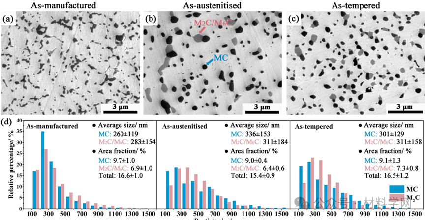 图3所示。离子诱导二次电子显微图显示(a)加工态、(b)奥氏体化态和(c)回火态钢基体中碳化物的分布;(d) MC和M2C/M6C碳化物的粒度分布直方图。注:灰色颗粒为M2C/M6C碳化物,深色颗粒为MC碳化物。