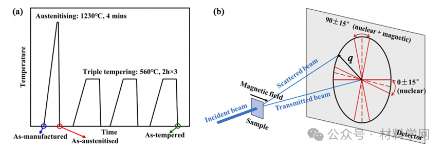 图1所示。(a)热处理程序示意图和三种样品条件;(b) SANS实验设置。为了得到散射强度的一维图,在±15?扇区进行方位角平均。