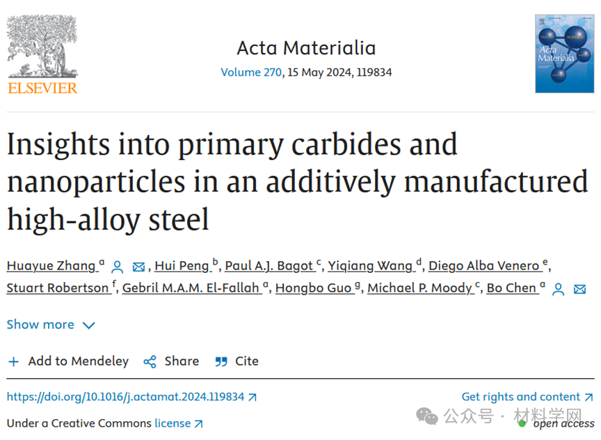 相关研究成果以“Insights into primary carbides and nanoparticles in an additively manufactured high-alloy steel”发表在Acta Materialia上。