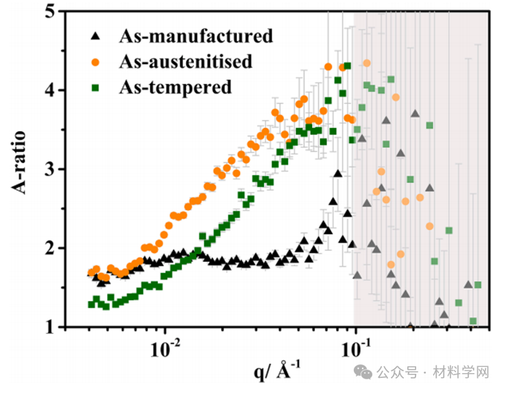 图9所示。根据图7a-7c所示的SANS数据计算的所有三种样本条件下的A-ratio与q的关系图。