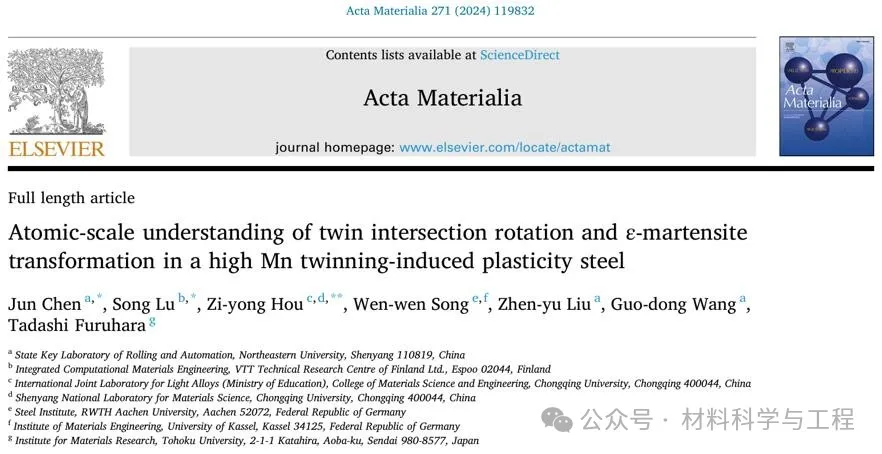 相关研究成果以题为“Atomic-scale understanding of twin intersection rotation and ε-martensite transformation in a high Mn twinning-induced plasticity steel”发表在金属材料领域期刊Acta Materialia上。