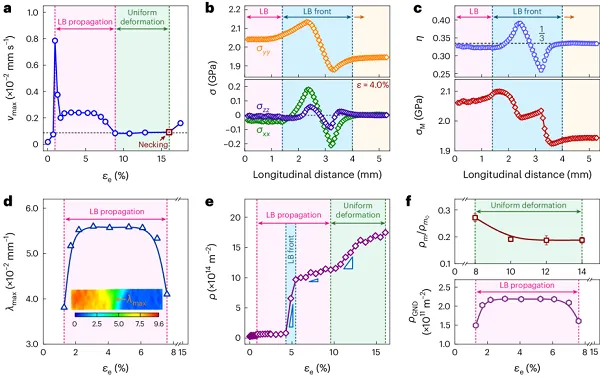 图2 LB前端的早期颈缩、塑性响应和位错增殖 © 2024 Springer Nature