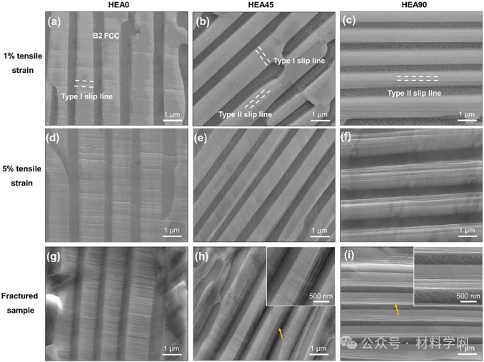 (h)和(i)的右上角显示了一幅放大图像,显示了滑移线在相界处的堆积。(a)、(b)和(c)中的白色虚线表示I型和II型滑移线。(h)和(i)中的黄色箭头突出了II型滑移线在相界处的堆积。ⅰ型滑移线垂直于相界,ⅱ型滑移线平行于相界。
