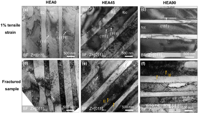 (f) HEA90试样断裂后在断口附近的TEM图像。白色和黄色箭头分别表示位错几乎垂直于相界和平行于相界。