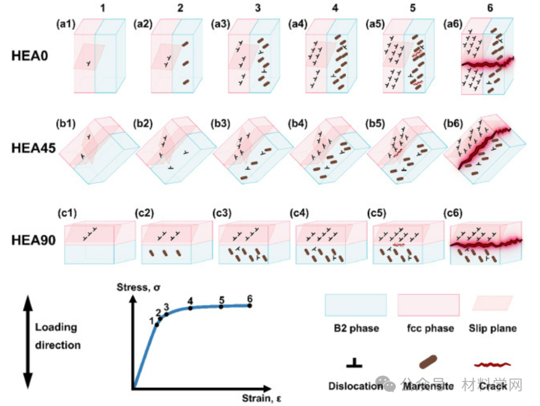 数字1到6代表张力的不同阶段。(1) fcc相的屈服;(2)试样弹塑性变形。HEA0和HEA90试样的马氏体相变发生在B2相屈服之前,而HEA45试样的马氏体相变发生在B2相屈服之后;