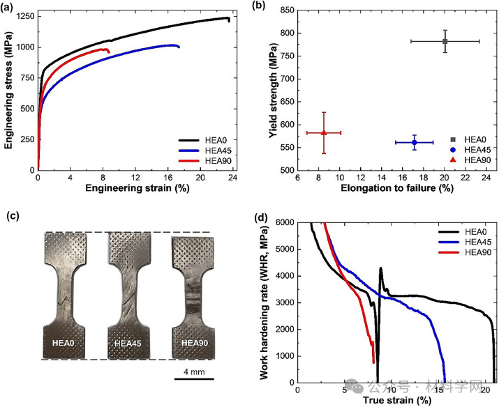 (b) HEA0、HEA45和HEA90试样的屈服强度和断裂伸长率比较,HEA0试样的屈服强度和拉伸延展性均最高。