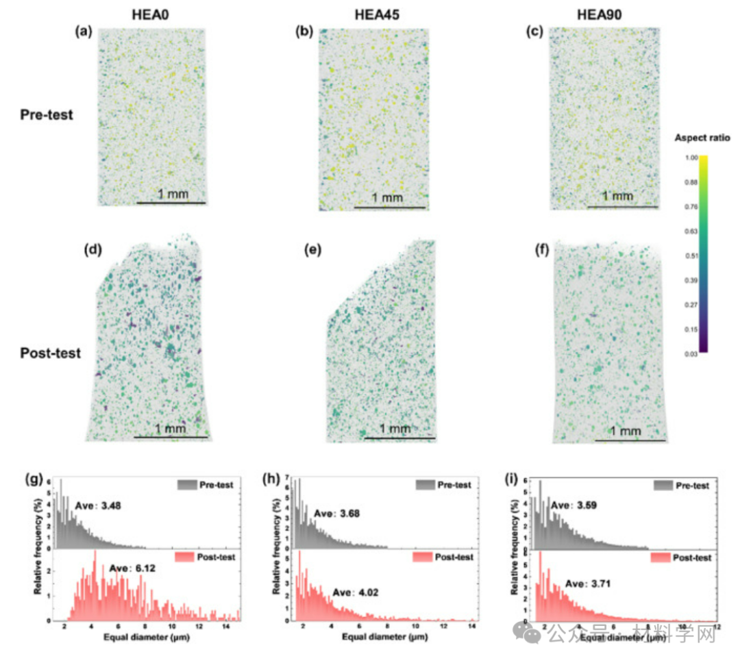 (g) HEA0, (h) HEA45, (i) HEA90试样拉伸前后等直径内部微孔的相对频率。“Ave”表示微孔的平均等径。
