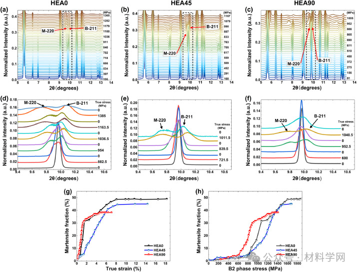 (a) HEA0、(b) HEA45和(c) HEA90样品的综合强度随真应力的演化。不对称B2峰表示相变的发生。循环加载过程中B2-{211}和M-{200}峰的变化表明(d) HEA0、(e) HEA45和(f) HEA90样品的马氏体转变过程具有部分可逆性。拉伸过程中马氏体相的相对含量分别随(g)真应变和(h) B2相应力的变化。