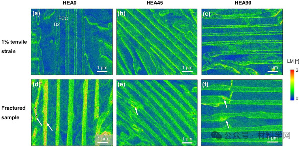 在HEA0样品中,在B2相内观察到高水平的取向错误,而在HEA45和HEA90样品中,取向错误沿着相界表现出来。图右侧的“LM”表示局部定向错误的程度。