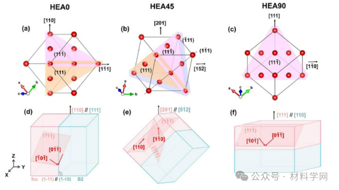 图9所示。(a) HEA0, (b) HEA45, (c) HEA90样品的fcc相滑移面定向晶格模型示意图。紫色、黄色、蓝色和灰色的平面分别代表(11-1)、(111)、(-111)和(1-11)平面。灰平面垂直于纸张,因此呈现为一条线。在轴系中,a、b、c分别代表[100]、[010]、[001]方向。(d) HEA0, (e) HEA45和(f) HEA90样品中fcc相的滑移面和方向示意图。