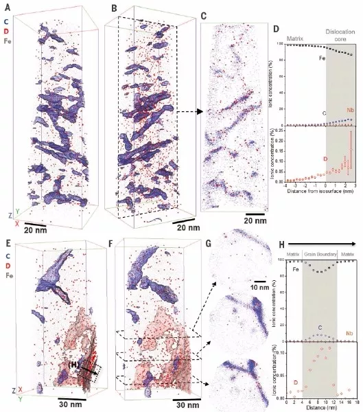 对氢陷阱的直接观察将有助于开发出更耐氢脆的材料。为此,研究人员通过低温转移原子探针层析成像技术来观察钢中特定微观结构特征下的氢。结果表明,氢原子被钉扎在钢中位错、晶界、析出相等位置不同界面。在富碳的位错和晶界处直接观察到了氢,这为氢脆模型提供了实验证据。在NbC析出相与钢基体不相连的界面处也观察到了氢。这直接证明了不相连的界面处可成为氢陷阱,这一发现对于设计抗脆性钢具有重要重义。