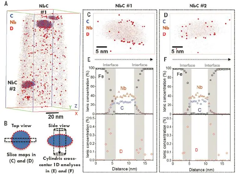 氢脆现象是阻碍高强钢广泛使用的一大因素,氢在诸如燃料电池之类的能源领域也具有重要应用。但氢会扩散到材料中并使它们更容易断裂,氢脆涉及多尺度氢缺陷的相互作用。由于氢原子质量小,容易迁移,采用常规技术手段难以确定氢在材料中的精确位置,从而限制了人们对氢脆现象的理解。热脱附光谱法可以识别氢的保留或捕获,但是这些数据很难和不同微观组织特征的相对贡献联系起来。