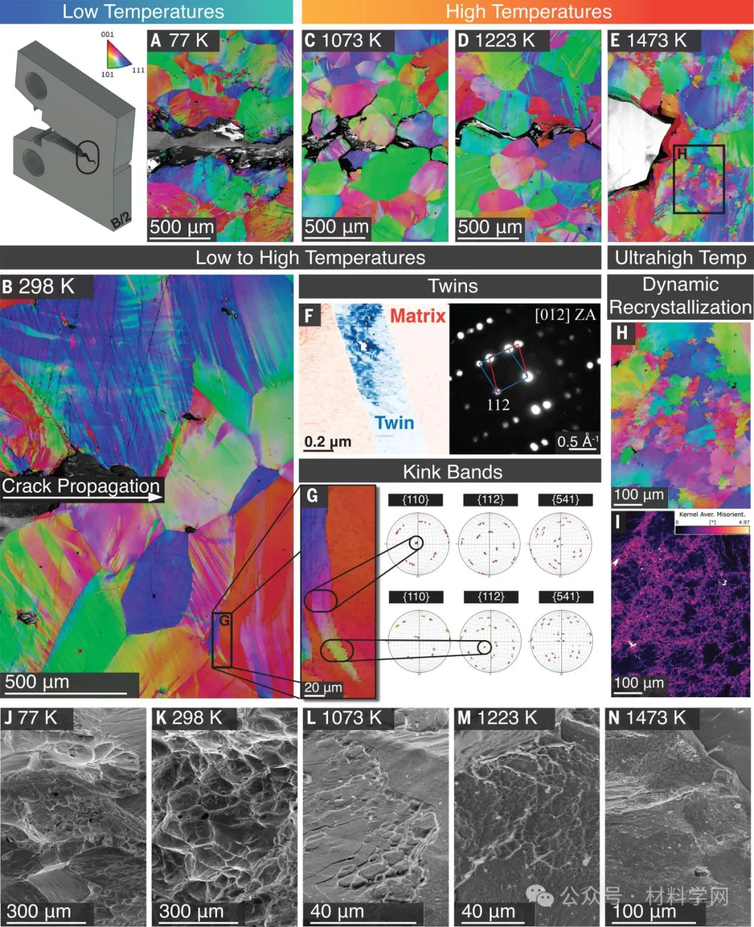 (A 至 E) 断裂路径的 EBSD BC 和 IPF 图(从左到右)。在 C(T) 样品的中厚度处取样,以研究最高应力三轴性区域的机制。(G) 298 K 时裂纹正前方塑性区的扭结带以及相关的晶粒内错向轴分析表明,该扭结带从扭结{112}族中的一个平面内部扭曲到扭结{110}族中的一个平面。(F)在超高温(1473 K)下,这些机制被(H)和(I)所示的动态再结晶所取代,动态再结晶破坏了原始晶界,抑制了促进晶间断裂的机制。(J至M)断裂表面显示了开氏77度(J)时的劈裂和韧性微泡凝聚的混合物,开氏298度(K)时的微泡凝聚,以及开氏1073度和1223度时的晶间断裂和微泡凝聚的混合物[(L)和(M)]。在 1473 K(N)时,断裂面被氧化破坏。