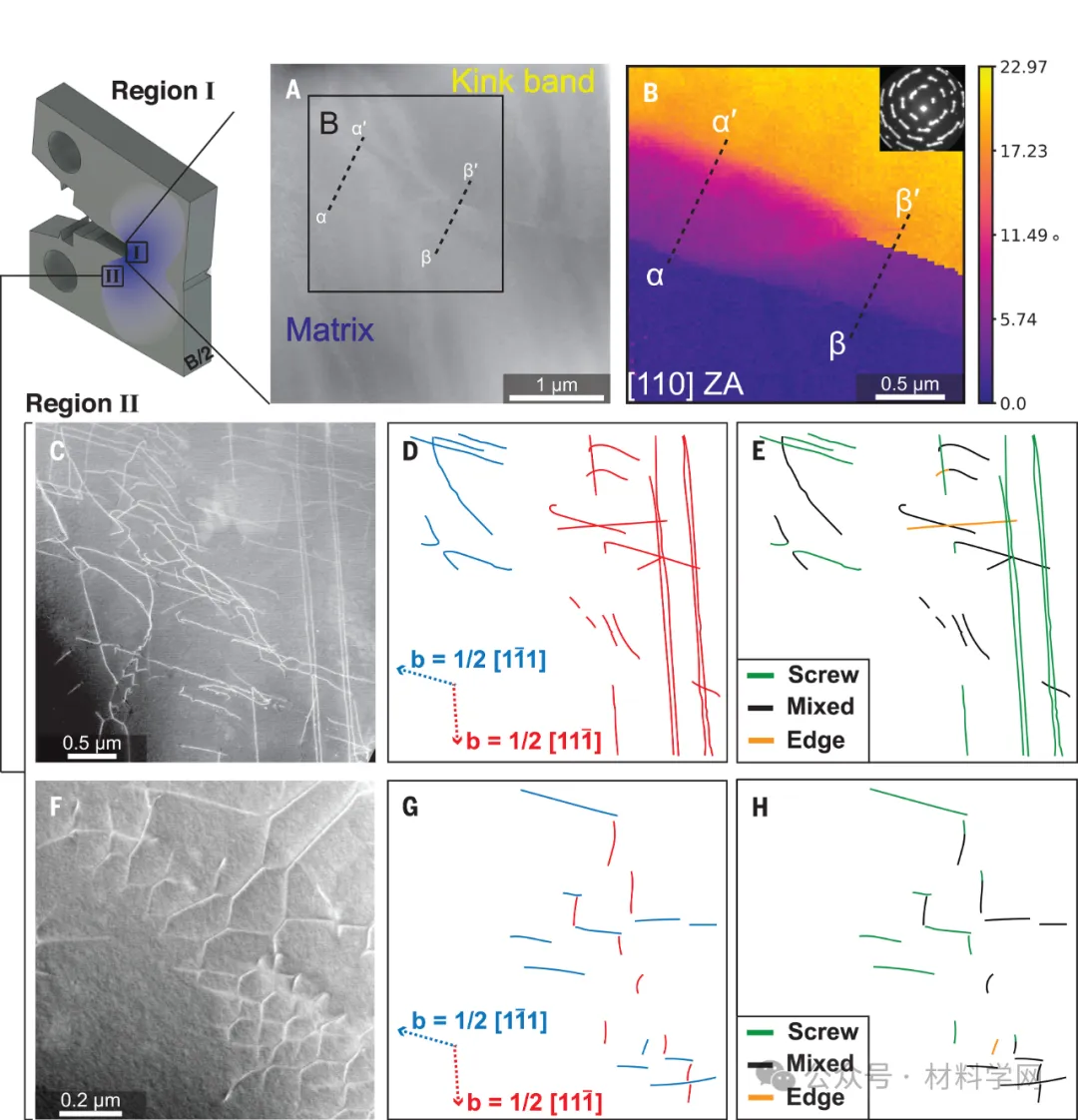 用 TEM 对在 298 K 下测试的 C(T) 样品的两个区域进行了研究:区域 I 与 (A) 和 (B) 相对应,来自靠近裂纹尖端的扭结带边界,那里的塑性应变较高;区域 II 与插图 (C 至 H) 相对应,显示了裂纹后基体中存在的位错,那里的塑性应变较低。(A) 聚焦离子束抬出样品的高角度环形暗场(HAADF)概览图像。(B) 4D-STEM 数据集的旋转图。(插图)显示晶格旋转的所有像素的总衍射图样。(C)和(F)] HAADF 对螺钉位错、边缘位错和混合位错的概述。(D)和(G)] 位错示意图,按各自的布尔格斯矢量着色:红线、 蓝线、 图中注释了布尔格斯矢量方向。[(E)和(H)] 相同位错的示意图,按其特性着色。