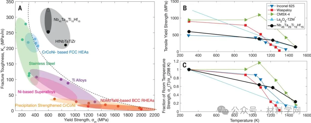 (A)Nb45Ta25Ti15Hf15 以及其他高熵合金和商用材料(4、9、10、34、48、57-59)的室温断裂韧性与屈服强度的 "香蕉图"。这种 RHEA 在很宽的温度范围内(60-63),强度和韧性都非常平衡。(B)屈服强度与温度关系图显示,Nb45Ta25Ti15Hf15 在中温以上的性能优于大多数商业级高温材料;(C)显示,尽管其室温拉伸屈服强度相对较低,但在 1473 K 时仍能保持优异的拉伸强度,甚至超过了 1400 K 以上的镍基超合金 CMSX-4。