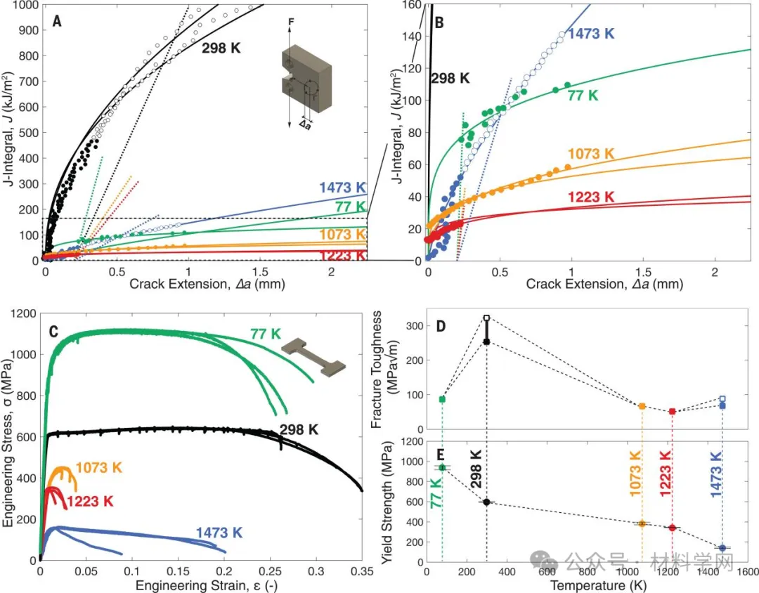 (A)开氏 77 度、298 度、1073 度、1223 度和 1473 度时作为裂纹扩展函数的 J 积分 R 曲线;(B) 在极端温度下测量的 R 曲线近景。(298 K 时的动态应变老化与 Lüders 带的形成相对应,而 77 K 时的应力下降则与孪生相对应,孪生伴随着声发射。(D) 根据 R 曲线得到的 JIc 值计算出的断裂韧性 (KJIc) 和 (E) 屈服强度 (σy)与温度的函数关系。误差条代表屈服强度的标准偏差;但有些误差条比数据符号小,因此不可见。请注意,在(D)中,Nb45Ta25Ti15Hf15 合金不仅在高温下保持强度,而且在所有温度下都表现出非凡的断裂韧性:在 77 至 1473 K 的五个温度范围内,断裂韧性分别为 86 MPa-m1/2、253 至 323 MPa-m1/2、67 MPa-m1/2、52 MPa-m1/2 和 68 至 88 MPa-m1/2。室温断裂韧性是已知单相 bcc 材料中最高的,甚至高于 fcc CrCoNi 基 HEA(19)。(A)、(B)和(D)中的开圆圈表示严格意义上无效的数值;为了清晰直观,(B)中排除了第二次液氮测试。