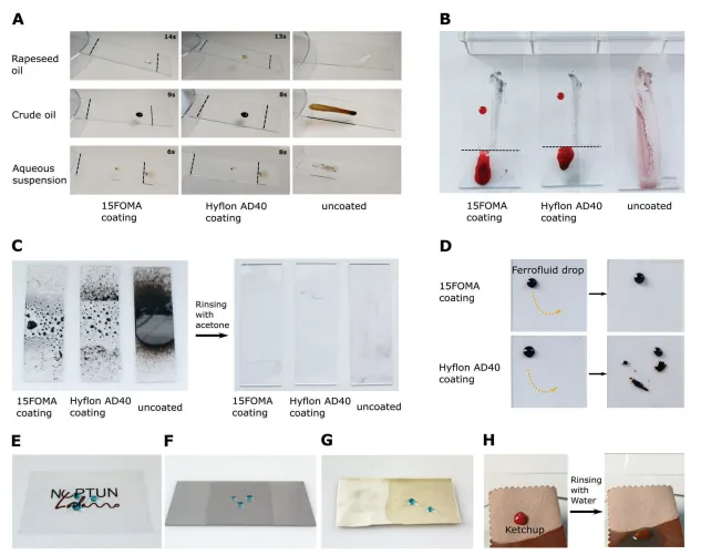图3:15FOMA表面的拒液性以及与Hyflon AD40表面和未涂覆的载玻片的比较。 A)15FOMA涂层对油和水悬浮液的排斥能力。菜籽油、原油和咖啡水悬浮液从15FOMA表面和Hyflon AD40表面滑落而不留下痕迹,而它们完全润湿了未涂覆的载玻片。 B) 在15FOMA和Hyflon AD40上,分散的碳化硅颗粒很容易用水(染成红色)去除。在未涂覆的载玻片上,水润湿了表面,没有去除颗粒。 C) 抗涂鸦能力:溶剂型涂料在载玻片上展开时,会在15FOMA和HyflonAD40表面收缩成小液滴。油漆很容易用丙酮从15FOMA表面和Hyflon AD40冲洗掉,而载玻片上留下了污渍。 D)铁磁流体在15FOMA表面和Hyflon AD40表面上的运动。液滴在15FOMA表面上容易移动,不会留下痕迹。然而,在Hyflon AD40上,液滴会分成较小的液滴,并固定在表面。E–G)在涂有15FOMA的不同基材上排斥水滴。 E)聚碳酸酯片,F)钢板,G)超细纤维布。在布的未涂覆区域(左),水滴被直接吸收到织物中,但在右涂覆区域被排斥。H)番茄酱滴在涂有15FOMA的超细纤维布上的排斥性。番茄酱滴被成功地从布的表面冲洗掉,没有在表面留下痕迹。