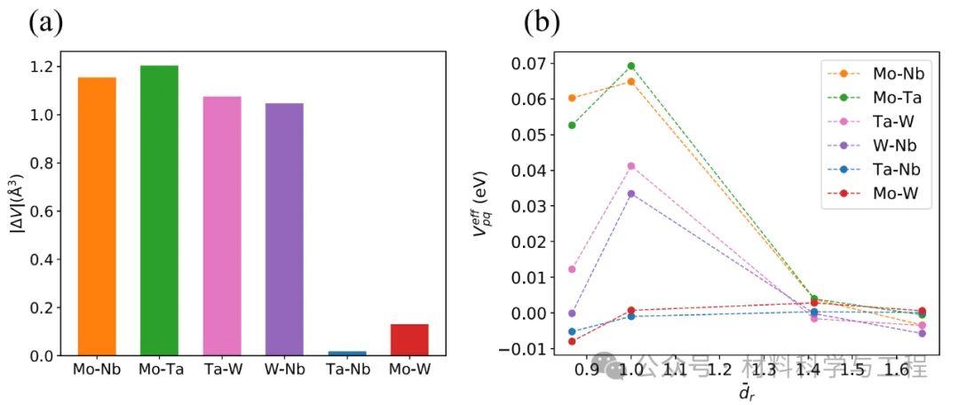 图 1. (a) 用 EAM 电位计算的铌钽钨合金族中浓度为 50%-50%的二元合金的绝对错配体积。(b) 用 EAM 电位计算的 BCC MoNbTaW 系列的有效对电位 Veffpq 与归一化 rth 近邻对分离 dr 的有效对电位与归一化近邻对间隔的函数关系。