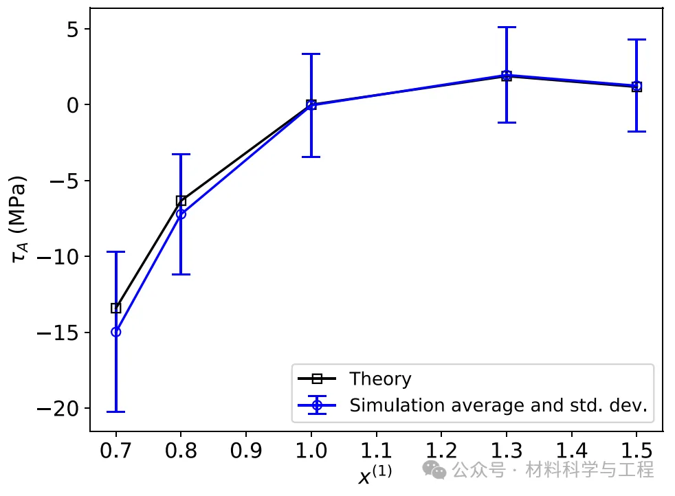 图 4. 平均强化应力τA直接原子模拟和使用 4 个近邻对的 SRO 进行的理论预测。相应的 SRO 参数如图 3 所示。