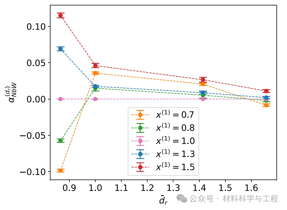 图 3. 不同 x(1) 值的蒙特卡罗模拟计算得出的两种不同元素(本文中为 W 和 Nb)之间的 SRO 参数(4 个样本的平均值和标准偏差),作为归一化 r-最近邻对分离度的函数