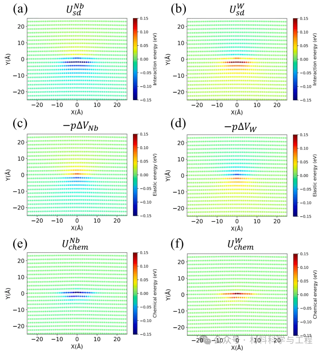 图 2. (a) 和 (b) 显示平均原子NbW 合金中 Nb 溶质和 W 溶质的溶质-边缘位错相互作用能量 Un sd,i。(c) 和 (d) 显示 Nb 和 W 溶质的溶质-边缘位错相互作用 Unsd,i的弹性估计值。(e) 和(f) 显示残余化学Un chem相互作用。