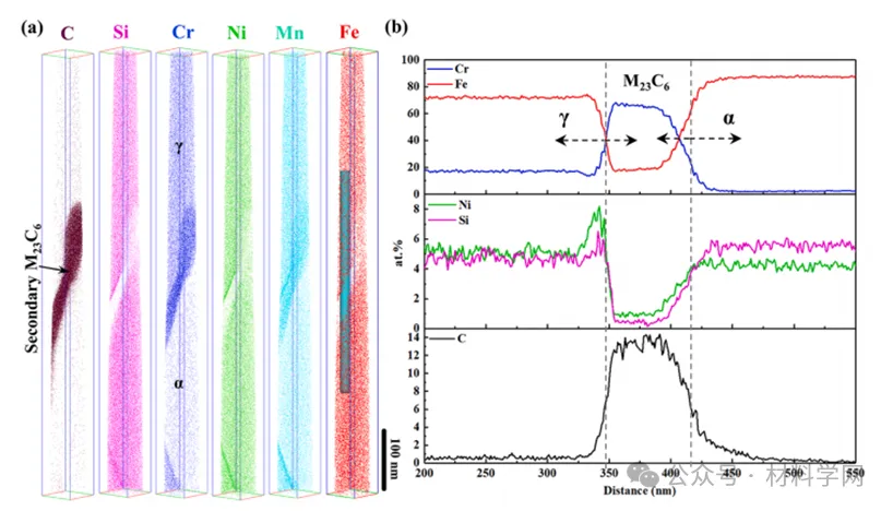 (b)选定元素在奥氏体、次生M23C6碳化物和α-铁素体中的相应1D浓度分布图。