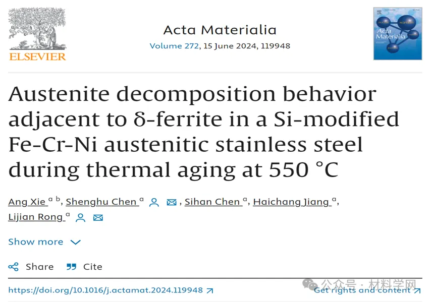 相关研究成果以“Austenite decomposition behavior adjacent to δ-ferrite in a Si-modified Fe-Cr-Ni austenitic stainless steel during thermal aging at 550 °C”发表在Acta Materialia上