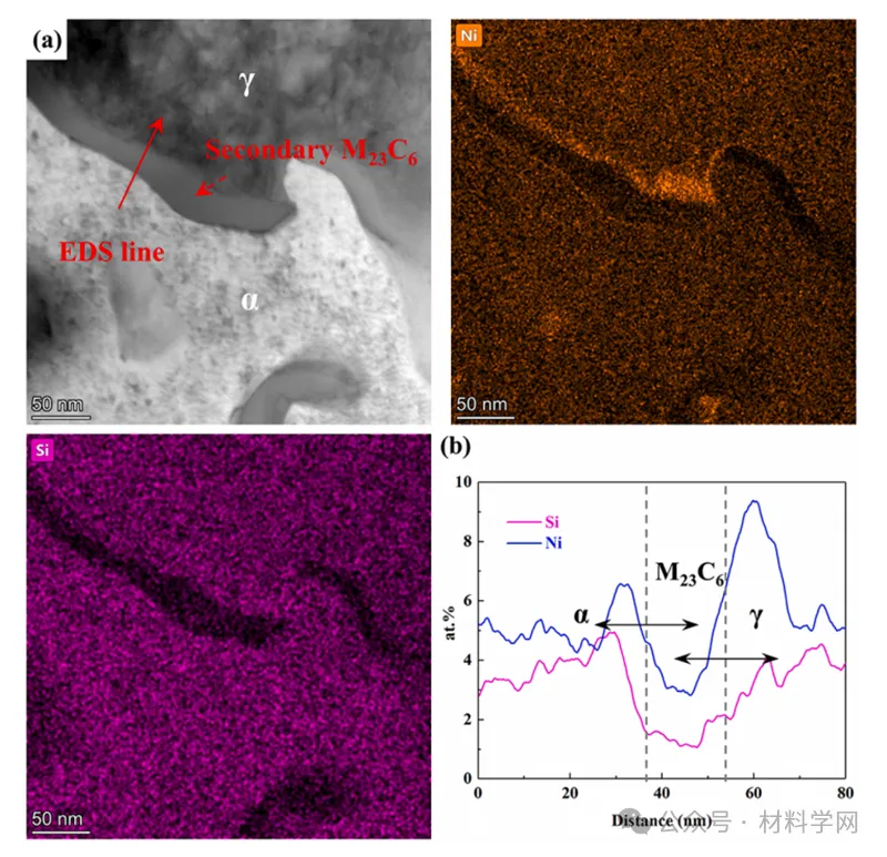(a) BF图像和相应的Ni、Si映射,(b) α-铁素体、M23C6次生碳化物和奥氏体的EDS线扫描。