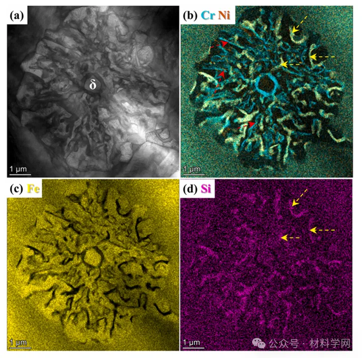(a) BF图像,(b-d)对应的Cr, Ni, Fe和Si的EDS映射。