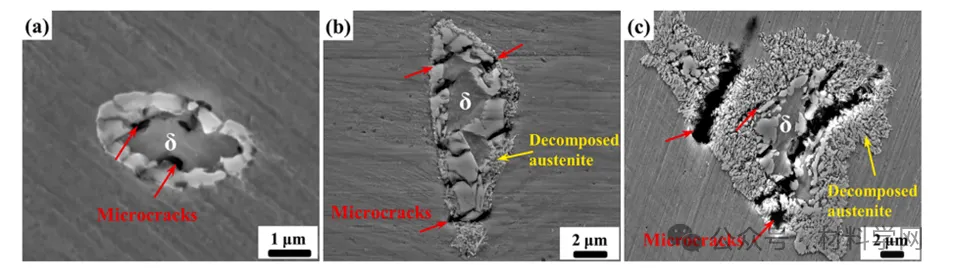 图19(a) δ/γ界面生成初生M23C6碳化物,(b, c) γ→M23C6+ α转变,