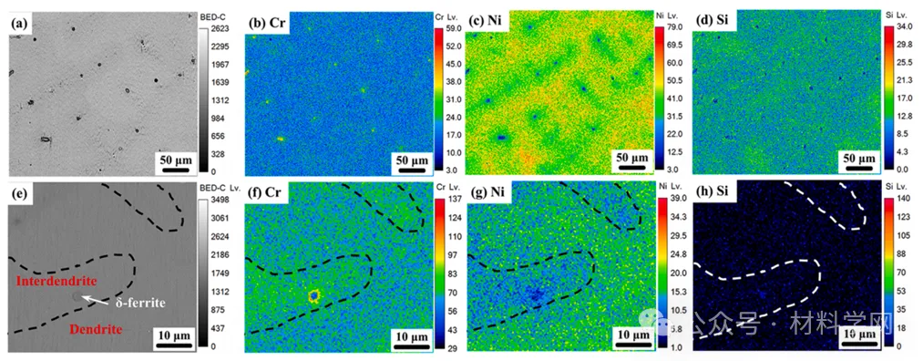 EPMA进一步观察了树突核之间和树突间的元素分布,如图2所示。OM显微图(图1b)和低倍率EPMA显微图(图2a)的综合结果显示,Cr和Si向枝晶间区域偏析,而Ni富集于枝晶核心区域(图2a-d)。可以看出,δ-铁氧体形成于Cr浓度最高的区域。高倍EPMA显微图清楚地显示,δ-铁氧体在树枝晶间区域形成(图2e-h)。在δ铁氧体中观察到Ni的严重耗损和Si的明显富集(图2g和h)。此外,与δ铁氧体内部相比,δ铁氧体周围区域观察到明显的Cr富集(图2f)。