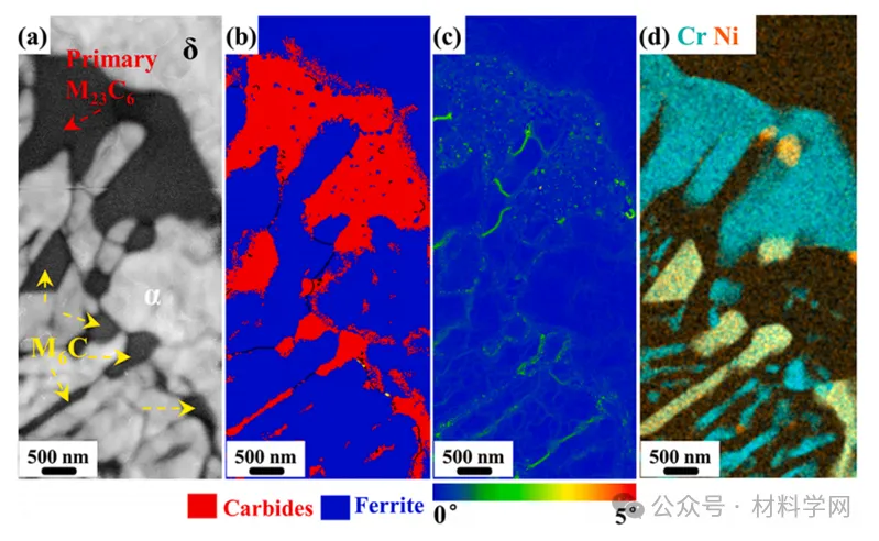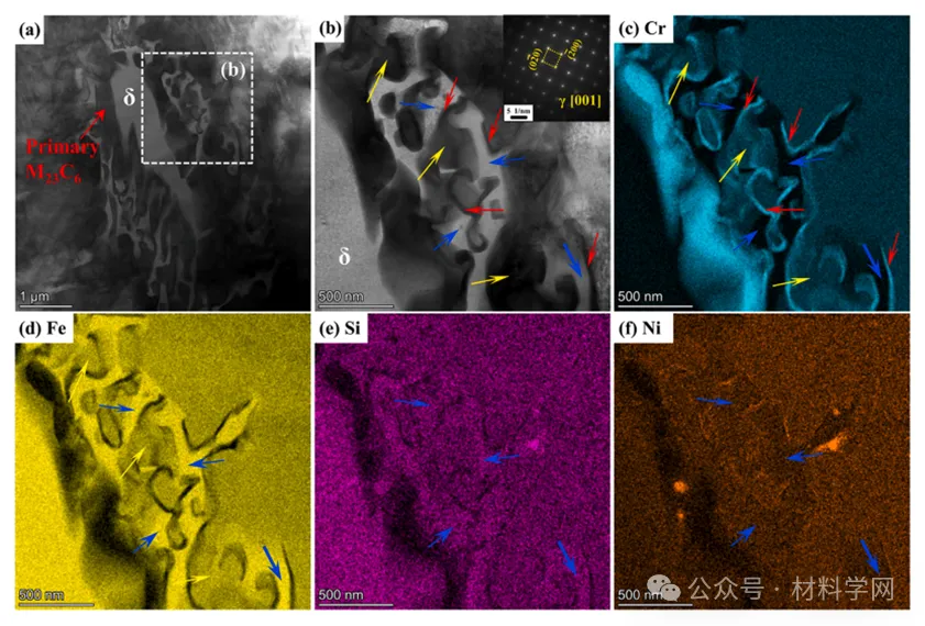 (a)HAADF图像和相应的Cr和Ni组合的EDS元素映射,所示为δ-铁氧体和初生碳化物M23C6对应的选定电子衍射(SAED)图。