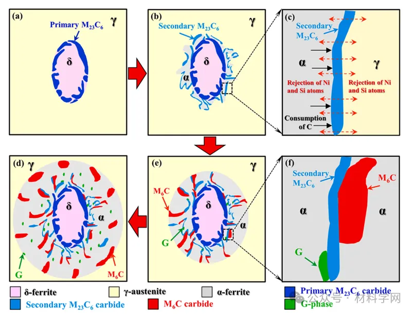 (d)生成孤立M6C碳化物和g相的奥氏体分解机理示意图。