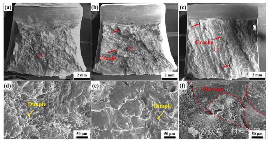 图16(a、d)铸态试样和(b、e)时效50 h和(c、f)时效500 h试样冲击后的断口表面。