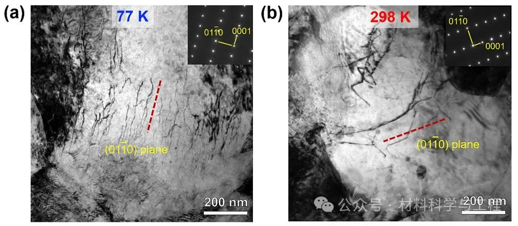 图7. 在(a)77 K和(b)298 K下变形至~3.8%应变的异质结构钛的位错滑移行为的TEM照片。综上所述,本研究揭示了异构纯钛优异的低温力学性能,其打破了均匀结构纯钛低温下的强度-塑性倒置关系。研究表明,与室温相比,低温强化了HDI效应,使异构钛的低温力学性能得到极大提升。首先,低温增大了Hall-Petch系数,导致异构区域间的机械不相容性增加,因增强了塑性变形时不同晶粒间的应变配分效应,产生大量的GNDs。其次,低温抑制了交叉滑移而有利于平面滑移和位错塞积。这促进了GNDs的堆积,并且平面滑移使位错更有可能塞积在晶界上,从而诱发更高的HDI应力。本文提出的关于异构纯钛的低温强韧化策略可扩展到其它异构材料,为设计低温高性能结构材料提供了参考。