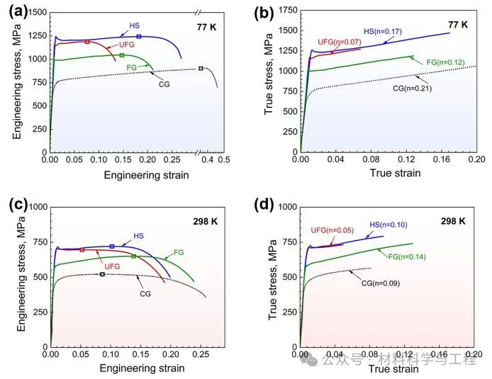 图2. 均匀结构和异质结构钛的拉伸性能。(a)77 K 时的工程应力-应变曲线和(b) 真应力-应变曲线。(c)298 K时的工程应力-应变曲线和(d)真应力-应变曲线。在(b)和(d)中计算了相应曲线的加工硬化指数(n)。