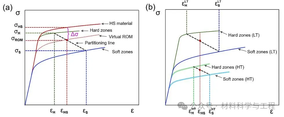 图6. (a)塑性变形过程中机械不相容性导致异质结构应变分区()的示意图。(b)在两个变形温度下,由于机械不相容性的改变,应变分配的程度不同。