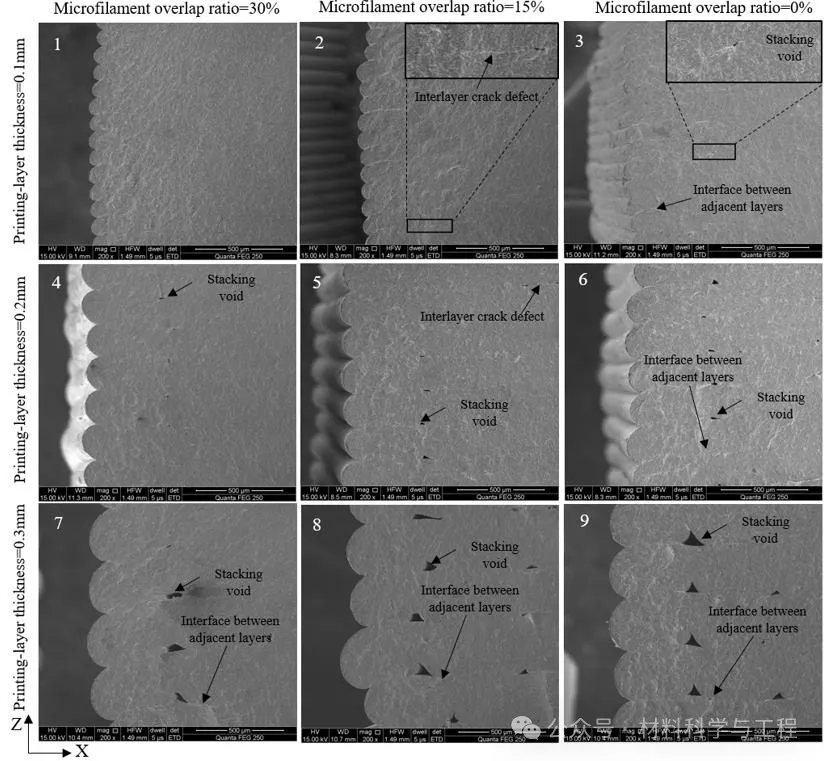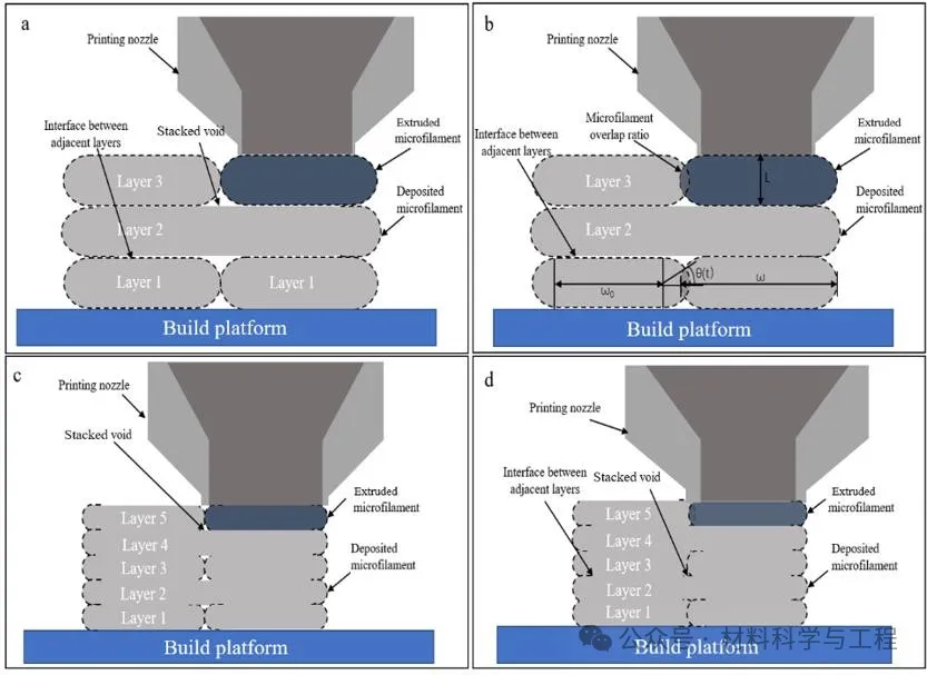 图2硬质合金打印生坯堆叠孔隙形成示意图:a. MEX堆叠孔隙形成;b.提高微丝重叠率有利于减小生坯堆叠孔隙;c.降低打印层厚可减小生坯堆叠孔隙;d.同时提高微丝重叠率和降低层厚,可消除生坯堆叠孔隙。