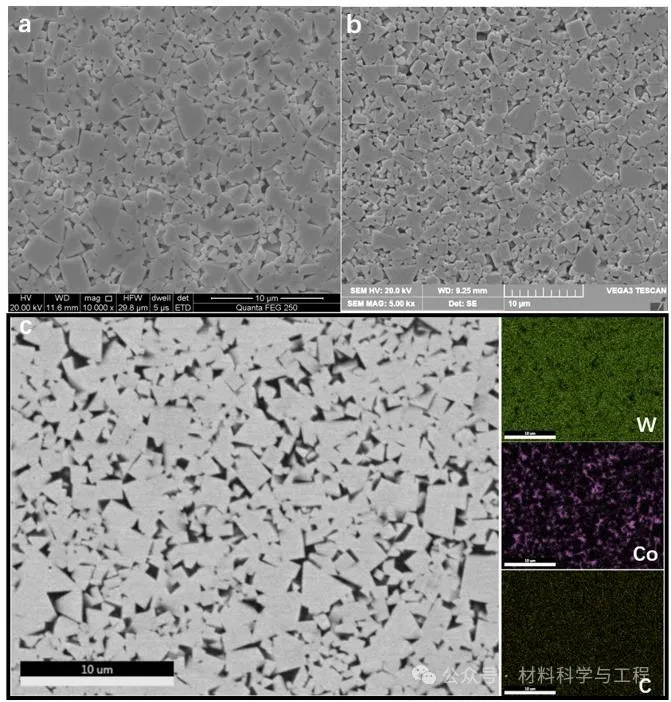 图5 WC-9Co硬质合金显微组织:(a, c) MEX-DS;(b)压制成形-脱脂烧结