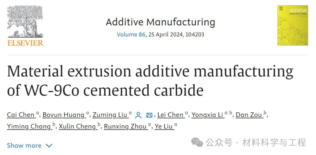 近日,中南大学粉末冶金国家重点实验室与湖南博云东方粉末冶金有限公司合作,采用材料挤出增材制造(Material extrusion additive manufacturing, MEX)–脱脂烧结(DS)技术,首次制得无孔隙、无裂纹,各向收缩均匀的高强韧两相WC-9Co硬质合金,其相对密度约为99.7%,维氏硬度、横向断裂强度和断裂韧性分别达到1525±3HV30、3492±45MPa和20.4±0.5 MPa·m1/2,综合力学性能与粉末冶金工艺制备的高性能硬质合金相当。相关工作以“Material extrusion additive manufacturing of WC-9Co cemented carbide”为题,发表在在国际顶级期刊《Additive Manufacturing》,期刊IF=11。该研究在黄伯云院士指导下完成,博士生陈才为本文第一作者,刘祖铭教授为通讯作者,中南大学为本文通讯作者单位。