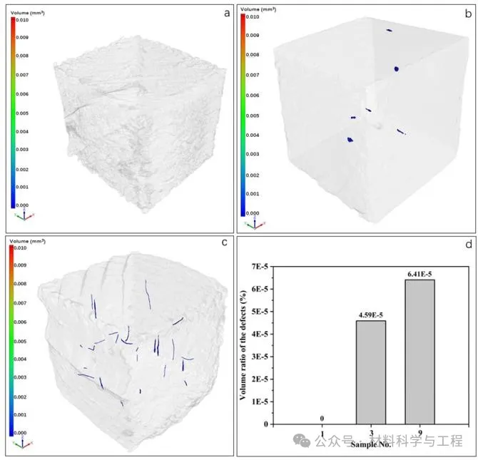 图4 MEX-DS WC-9Co硬质合金内部缺陷Micro-CT分析结果