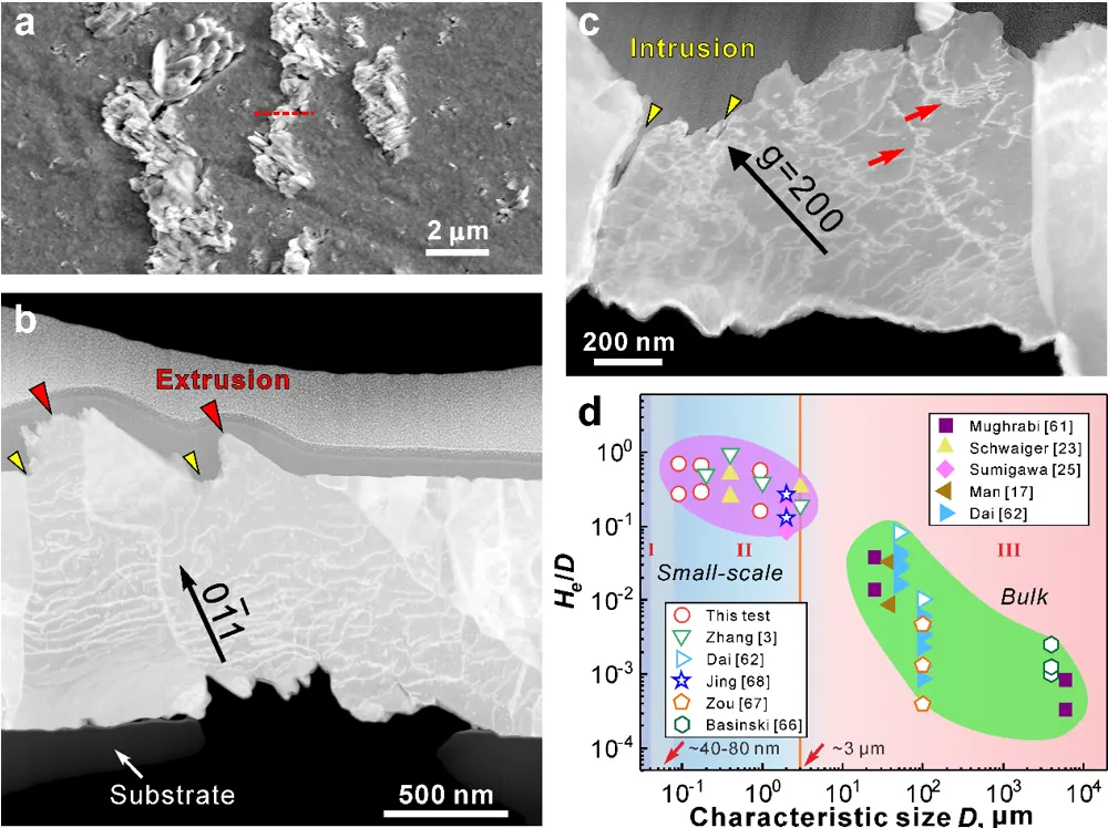 图1 (a)- (c) 930 nm厚Au薄膜表面疲劳挤出和侵入形貌和内部位错结构,(d) 不同材料相对挤出高度值对比,包括块体单晶、块体多晶、微柱、薄箔和薄膜材料。
