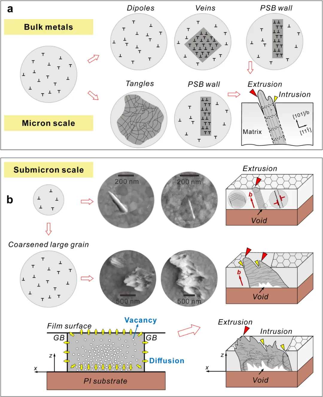 近年来,新能源、人工智能及信息通讯等领域的快速发展使得相关器件尺寸不断微小化,器件所用材料的特征尺度也不断向亚微米甚至纳米尺度减小。然而,这些微纳米尺度材料在长期服役过程中的疲劳可靠性已成为业界关注的焦点。值得注意的是,由于受几何尺度的限制,疲劳加载下的微纳尺度金属材料内部无法形成如传统疲劳理论认为的可引起疲劳损伤的微米尺度典型位错组态(如位错墙结构等),传统疲劳理论已无法描述微纳尺度金属疲劳行为。澄清微纳尺度(几何尺度< 1 mm)金属材料疲劳损伤微观机制,建立新的疲劳理论已成为目前疲劳研究领域中有待解决的基础科学问题之一。近期,中国科学院金属研究所沈阳材料科学国家研究中心的张广平团队在前期微纳尺度金属疲劳行为研究的基础上(Acta Mater. (2006)、Nat. Commun. (2014)、Mater. Res. Lett. (2017)、J. Mater. Sci. Technol. (2021)、Adv. Mater. Tech. (2022)),发现无典型位错组态出现的微纳米厚度Au薄膜仍会出现疲劳挤出/侵入的循环应变局部化行为(图1)。有趣的是,微纳尺度Au薄膜的相对疲劳挤出高度是随其几何尺度减小而增加的,甚至比对应块体粗晶材料高出近两个数量级,而其疲劳性能却明显优于块体粗晶材料。结合疲劳损伤的截面观察和空位缺陷的表征与理论计算,该团队揭示了微纳尺度金属疲劳过程中位错交互作用产生的空位及其扩散对疲劳挤出/侵入形成的作用机理,阐明了微纳尺度金属中空位辅助疲劳挤出/侵入生长及疲劳损伤的物理机制(图2)。这一空位主导的微纳尺度金属疲劳损伤机制的发现不仅将金属疲劳理论从宏观尺度扩展到微纳米尺度,且为诸如新能源器件用复合集流体、柔性电子器件以及微机电系统机械部件的疲劳可靠性设计提出了一种基于空位行为调控的界面工程策略。