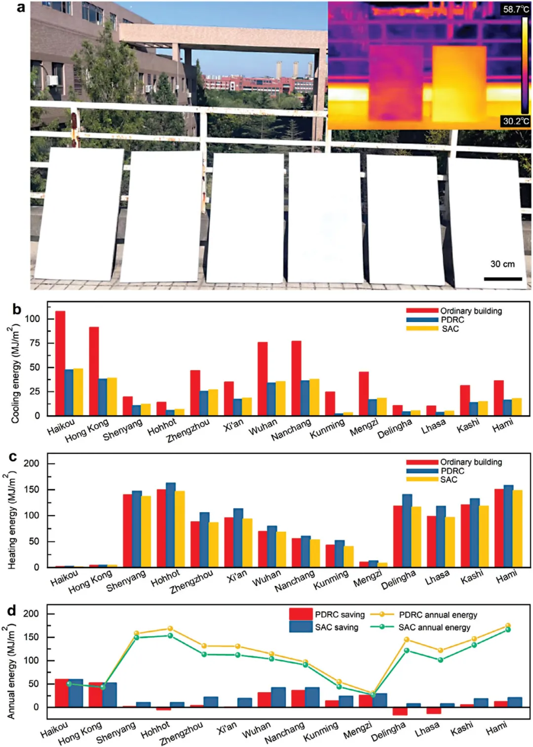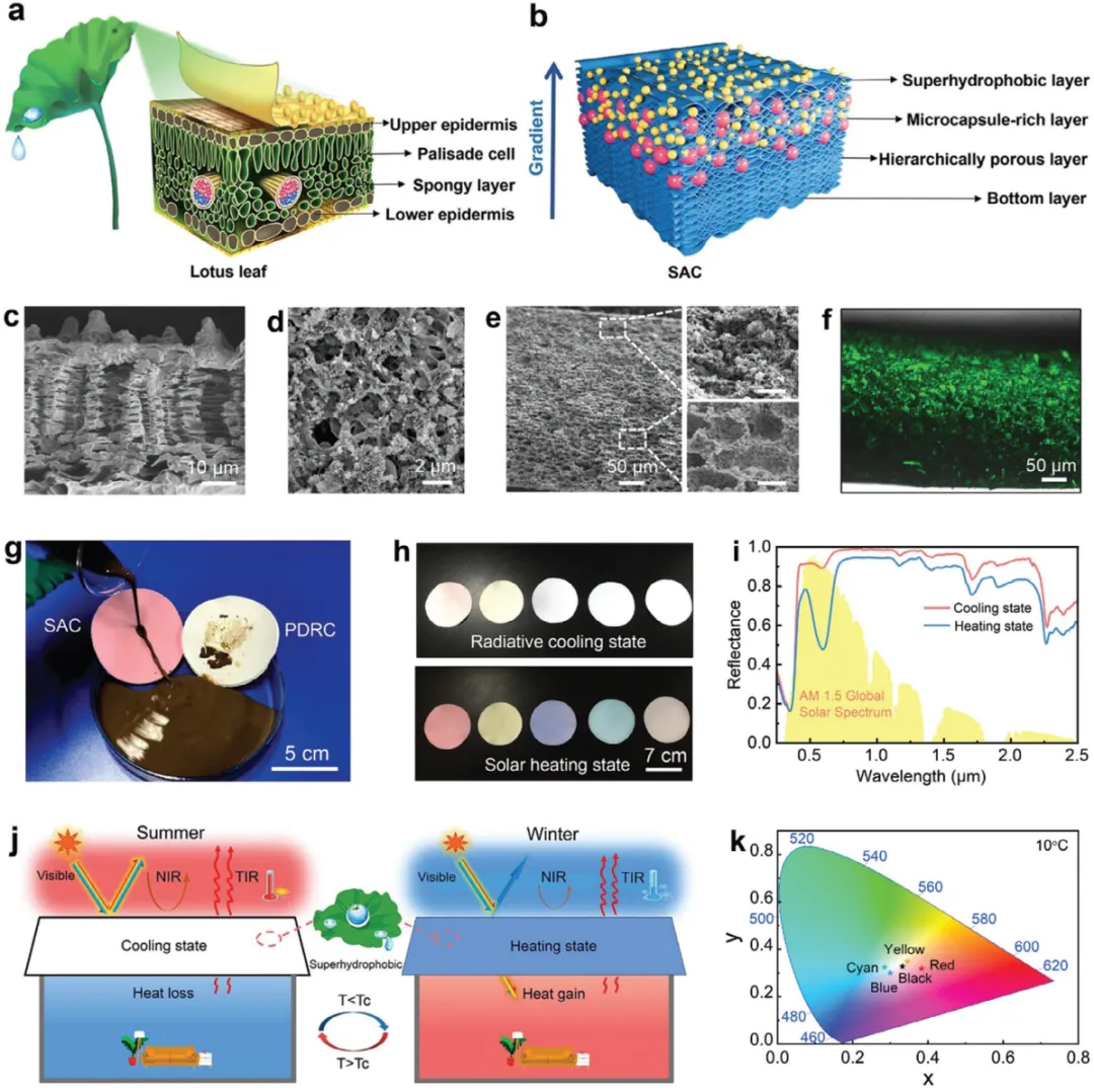 控制全球温室气体排放,对遏制全球变暖至关重要。无能源被动式日间辐射冷却(PDRC)涂层通过0.3-2.5μm的阳光反射,有效降低能源消耗,同时通过8-13μm的大气透明温度将热量输送到外层空间。近年来,科研人员已开发出多种PDRC材料,包括精心设计的涂层、元织物、元陶瓷、光谱选择性冷却器和多孔膜,即使在炎热天气中也能实现有效冷却。然而,高极反射率和强红外发射率在寒冷天气中可能导致过度冷却。为了满足全年热管理的需求,已设计出各种主动自适应系统,如电致变色设备和电调谐设备、具有双模飞行的机械可切换系统等等。然而,这些系统依赖于复杂的刺激或需要额外的能量来进行模式切换,这限制了它们的实用性。被动自适应辐射冷却的最新进展催生了多种热致变色材料,如VO2、锗锑碲化物、钙钛矿、热致变色微胶囊、热敏水凝胶、热诱导可再结晶结构、光学诱导材料和湿度敏感材料。这些材料旨在调节热不透光性,或在反射太阳能和允许光传输/吸收之间进行自主切换。尽管取得了进展,但大规模应用仍面临挑战。例如,VO2涂层需要复杂的光学谐振结构,锗锑碲化物和钙钛矿成本高昂且相变点固定,热敏水凝胶需要封装,光学/湿度敏感材料则面临稳定性和响应性问题。户外应用时,灰尘、雨水和细菌污染会影响光学性能和冷却/加热效果,使这些材料在实际使用中不可持续。因此,开发能够适应季节性温度变化同时保持超疏水自清洁功能的可扩展被动涂层,对其实际应用至关重要。然而,在超疏水涂层中将被动冷却和加热功能与冲突的光学特性相结合,仍然具有挑战性。近日,陕西科技大学薛朝华教授、华中科技大学陶光明教授、香港理工大学王钻开教授联合报道了受荷叶分级结构的启发,通过简单的一步相分离过程,制备了一种超疏水一体冷却(SAC)涂层,同时具有表面润湿性、光学结构和温度自适应能力。该涂层表现出不对称的梯度结构,具有表面嵌入的疏水性SiO2颗粒和在垂直分布的分级多孔结构内的表面下热致变色微胶囊。此外,该涂层具有超疏水性、高红外发射和可热切换的阳光反射率,能够在辐射冷却和太阳变暖之间实现自主转换。该一体化涂层有效避免了传统辐射冷却材料造成的污染和过冷问题,为智能调温涂层的大规模生产开辟了新的前景。相关研究工作以“Bioinspired Superhydrophobic All-In-One Coating for Adaptive Thermoregulation”为题发表在国际顶级期刊《Advanced Materials》上。在这项研究中,SAC涂层设计受植物叶片启发,如图1a所示,其梯度结构、栅栏组织、海绵层和下表皮均被借鉴。此外,植物叶片在大气透明窗口中具有较高的发射率。叶片的表皮作为保护屏障,包含上表皮和下表皮,而某些表皮细胞如荷叶,拥有低表面能蜡状和微纳米乳突结构,使表面具有超疏水性。栅栏组织富含叶绿体,位于上表皮下方,呈网格状排列;海绵组织则含有松散排列的叶绿体,位于栅栏组织之下。叶片上表面深色,下表面浅色,这种叶绿体分布的不对称性使光合效率提高。图1b为SAC涂层的示意图,灵感来自于荷叶的梯度结构。该涂层实现超疏水性和热光性的空间分离,其核心为含有P(VDF-HFP)和SiO2纳米颗粒的复合材料组成的微米/纳米结构孔分层排列。涂层上表面具有由低表面能聚合物P(VDF-HFP)组成的微纳多孔结构,中间穿插着疏水性SiO2纳米团簇,模拟荷叶上表皮特性,维持光学性能。微尺度P(VDF-HFP)/SiO2复合孔隙填充热致变色微胶囊(TCMC),而下层孔隙未填充,形成分层结构,包括微胶囊富集层和分级多孔层。TCMC响应温度变化,并与涂层的多孔结构协同工作,以调节阳光的光谱特性,实现高温反射和低温吸收。分级多孔层显著散射阳光,提高反射效率。P(VDF-HFP)作为主要基质,提供疏水性和红外发射特性,而SiO2增强红外发射率。涂层整合紫外线吸收剂、光稳定剂和抗氧化剂,以增强耐光性。这种多方面设计将红外发射、阳光反射/吸收和表面润湿特性融合到同一材料中,以实现能够提供无能量的夏季冷却和冬季变暖的超疏水一体式涂层。图2. SAC涂层在不同天气条件下的温度相关颜色转换、光学变化和自适应测试图3. SAC涂层的润湿性、机械坚固性和户外耐久性通过不对称梯度将热致变色微胶囊包埋到多孔结构中,制备了具有灵活热调节能力的无能量超疏水涂层。涂料旨在提供全年的热舒适性,实现冬暖夏凉。通过一步相分离过程实现,涂层将表面不可润湿性、被动冷却和加热与相互冲突的光学特性协同集成,使其能够在太阳能吸收率和吸收率之间自主切换,以适应温度变化和恶劣环境。值得注意的是,采用的溶液处理制造方法不仅简单,而且能够在同一涂层中集成了多种理想性能,为大规模制造智能热调节涂层铺平了道路。这种一体化的设计策略为全年节能提供了一种有前景和可持续的解决方案。
