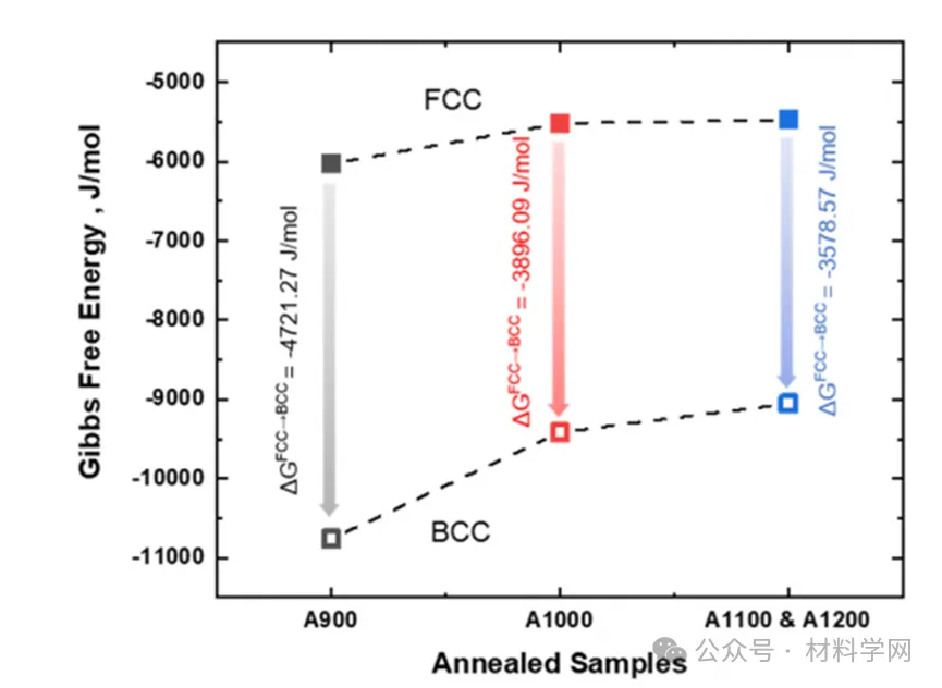 图9 FeMEA样品在不同退火条件下FCC和BCC相的吉布斯自由能。