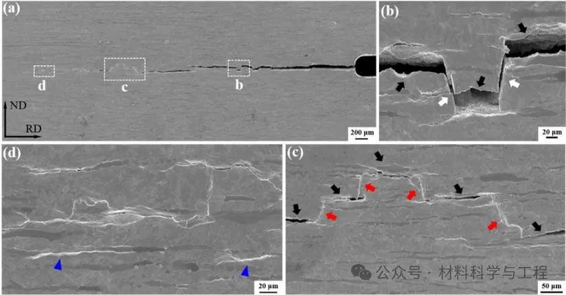 图 4. 垂直于轧制方向试样的裂纹扩展。(a)未断裂试样宏观断裂侧面的扫描电镜显微照片,显示了主裂纹的扩展。(b-d)特征区域的相应放大图。