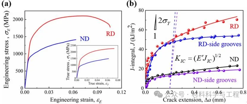 图 2. 所研究钢材的拉伸和断裂性能测试。(a)拉伸工程应力-应变曲线和相应的真实应力-应变曲线(插图)。(b)在室温(RT)条件下由紧凑拉伸(CT)试样测得的J积分阻力曲线(J-R曲线)。
