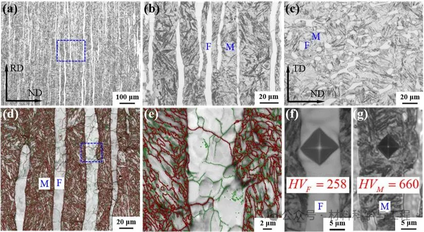 图 1. 所研究钢材的微观结构。(a)纵向显微组织的光学图像。(b)纵向显微组织的放大图,铁素体和马氏体分别被标记为“F”和“M”。(c)横截面显微组织的光学图像。(d)马氏体和铁素体的 EBSD 图像。(e)特征区域的放大图,其中红色实线表示高角度晶界,绿色实线表示低角度晶界。(f)和(g)分别为铁素体和马氏体在相同外加载荷下的显微硬度压痕。
